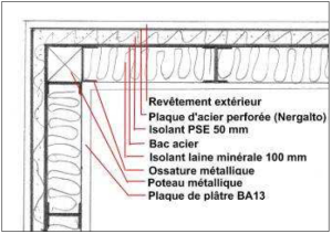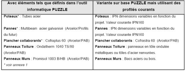 | Le système constructif allie une technologie constructive innovante pour le secteur du logement (construction industrialisée poteaux-poutres acier) et des outils informatiques spécialement développés. Les constructions sur la base de PUZZLE® sont réalisées grâce à une technologie constructive en filière sèche s’appuyant sur des composants industriels existants en acier ou bois pour la réalisation des parois. La structure porteuse est de type poteaux-poutres acier (profilés minces ARCELOR ou variante en profilés métalliques traditionnels) alors que les remplissages sont assurés par bardages aciers ou bois munis de complexes isolants intérieurs et d’une isolation extérieure générale. L’isolation extérieure (panneaux de polystyrène, par exemple) permet d’une part, de traiter les ponts thermiques de façade et, d’autre part, d’assurer le support pour tout type de finition extérieure. En toiture, la charpente acier peut recevoir tout type de couverture (tuiles, ardoises, etc.). L’isolation est réalisée au niveau des combles perdus par un isolant type laine de verre. Bien que cette isolation soit suffisante dans la grande majorité des cas, elle peut être complétée par des panneaux sandwichs support de couverture. Les planchers sont généralement de type "plancher collaborant acier-béton". Toutefois, il est tout à fait envisageable de réaliser des planchers en bois massif par exemple. EXEMPLE DE LISTE DES PRODUITS GENERALEMENT UTILISES CHARPENTE METALLIQUE